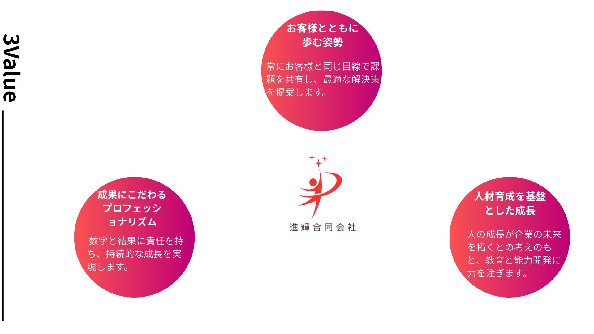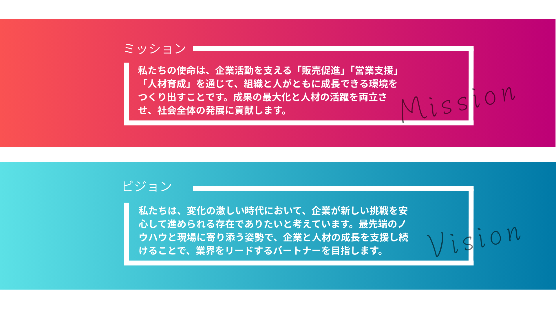 私たちの会社は、「可能性の扉を、ともに開く。」という理念を掲げ、販売促進活動の企画・支援、営業アウトソーシング、人材育成という三本柱を通じて、企業と人材の成長をサポートしております。