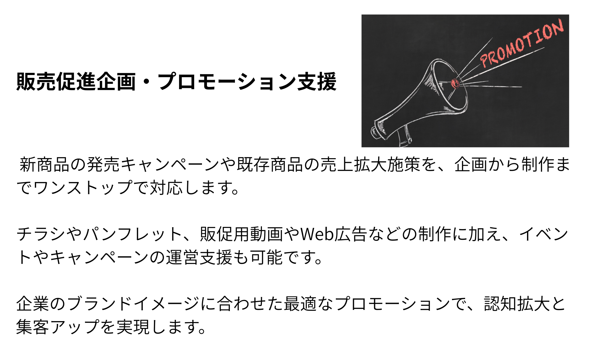 キャンペーン企画、販促ツール制作、イベント運営などをワンストップで支援し、売上拡大と認知向上を実現します。