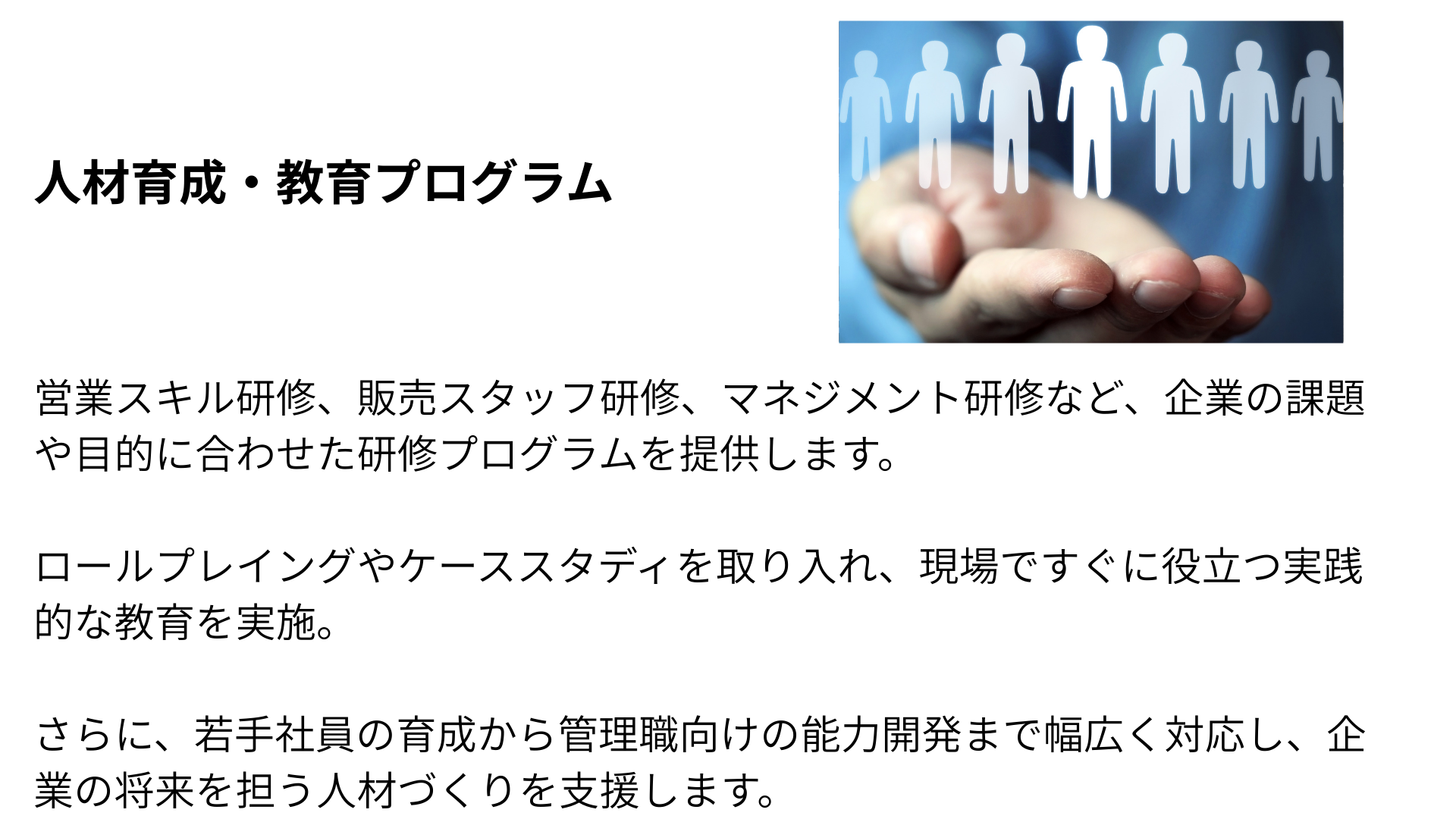 営業研修、販売スタッフ研修、マネジメント研修など、現場で即戦力となる人材の育成を実践的に支援します。