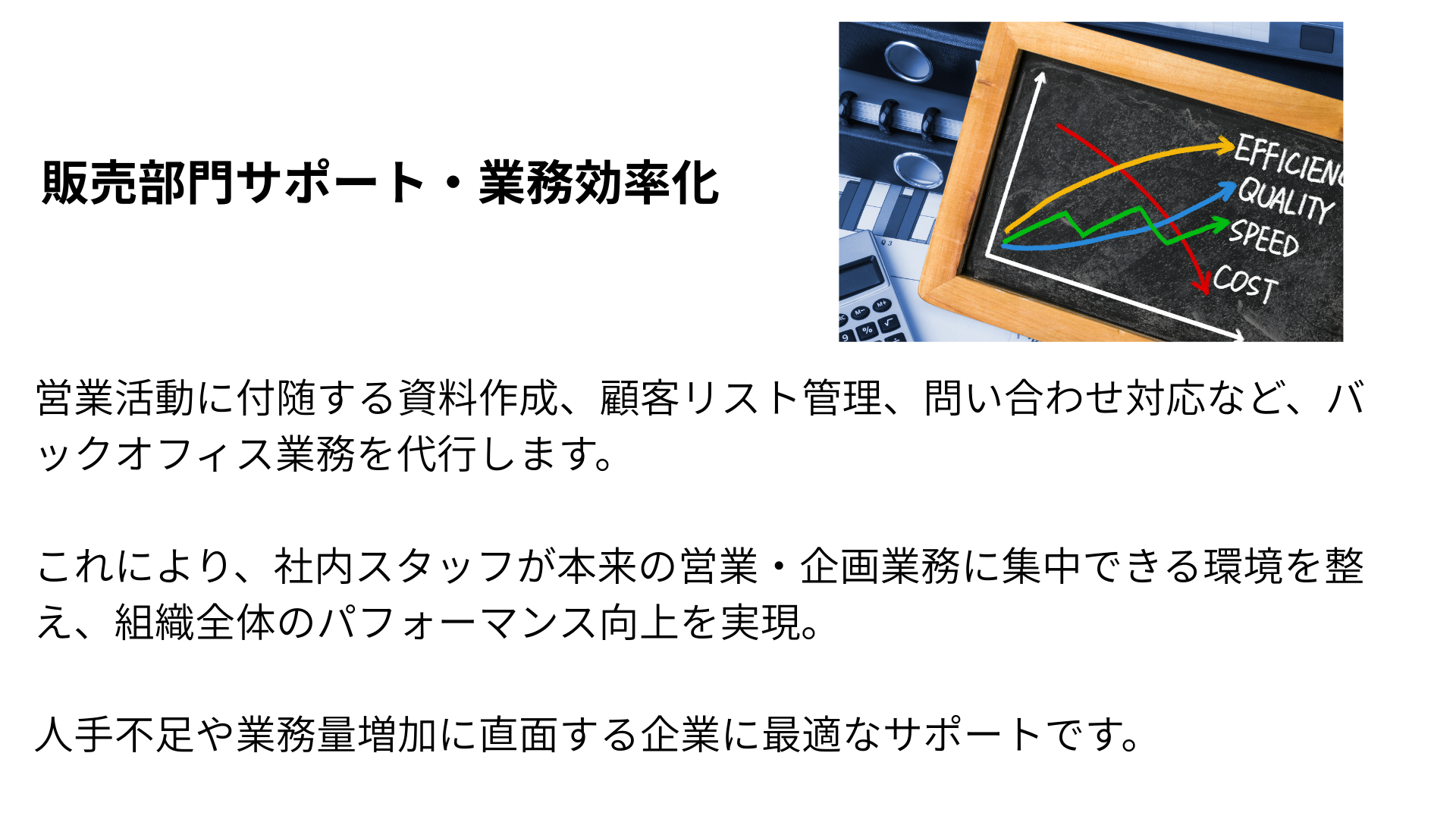 資料作成、顧客管理、問い合わせ対応などバックオフィス業務を代行し、営業活動に集中できる環境を整えます。